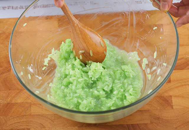 1. แบ่งข้าวเหนียวเป็น 3 ส่วน ส่วนที่ 1 1/2 ถ้วยตวง แช่ด้วยน้ำใบเตย ส่วนที่ 2 1/2 ถ้วยตวง ใส่ขมิ้นสดทุบพอแตก ส่วนที่ 3 1/4 ถ้วยตวง แช่รวมกับข้าวเหนียวดำอย่างน้อย 1 ชั่วโมง หรือจนกว่าข้าวเหนียวจะออกสี แช่ข้าวเหนียวในน้ำทุกสี ยกเว้นข้าวเหนียวดำ แช่เลยโดยไม่ต้องใส่สีจากธรรมชาติแต่อย่างใด ข้อสำคัญ ถ้าจะทำข้าวเหนียวดำห้ามแช่ข้าวเหนียวดำอย่างเดียว เพราะข้าวเหนียวจะสุกและแข็ง รับประทานไม่ได้ ต้องแช่โดยใช้ข้าวเหนียวขาว และ ข้าวเหนียวดำผสมรวมกัน แช่ตามเวลาแล้วนำไปนึ่งในน้ำเดือด ไฟปานกลาง ประมาณ 20-25 นาที หรือจนสุก