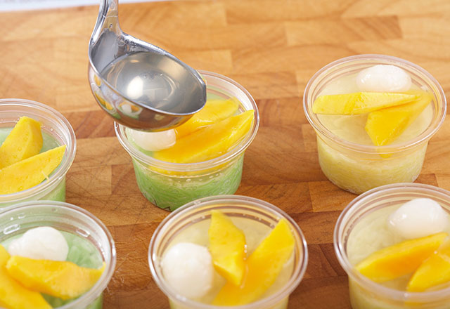 5.เริ่มเคี่ยววุ้นโดยใช้อัตราส่วนวุ้นผง 1 ช้อนโต๊ะ ต่อน้ำ 3 ถ้วยตวง น้ำตาลทราย 3/4 ถ้วยตวง โดยเคี่ยววุ้นกับน้ำให้ละลายเสียก่อน แล้วจึงใส่น้ำตาลทราย เคี่ยววุ้นต่ออีกประมาณ 20-25 นาที หรือจนกว่าวุ้นจะข้นใส นำวุ้นที่ได้ที่แล้วหล่อน้ำอุ่นไว้ ตักวุ้นหยอดข้าวเหนียวดำหรือทุก ๆ สีให้ทั่ว โดยหยอดจากข้างบนให้ไหลลงมาข้างล่างเอง วุ้นจะได้เรียบ