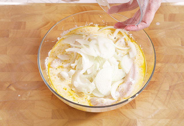 2. ใส่ไก่ และหอมหัวใหญ่คลุกเคล้าให้เข้ากันหมัก ไว้อย่างน้อย 3 ชั่วโมง หรือข้ามคืน (คอยพลิกไก่ให้ทั่ว)