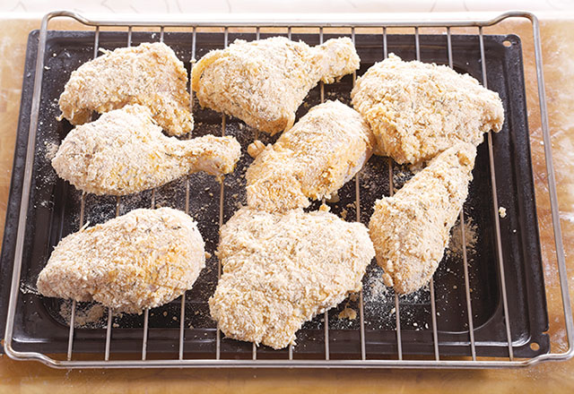 4. คีบไก่แต่ละชิ้นให้น้ำหมักหยดออกบ้างใส่ลง คลุกเคล้าในส่วนผสมขนมปังป่นให้ทั่ว