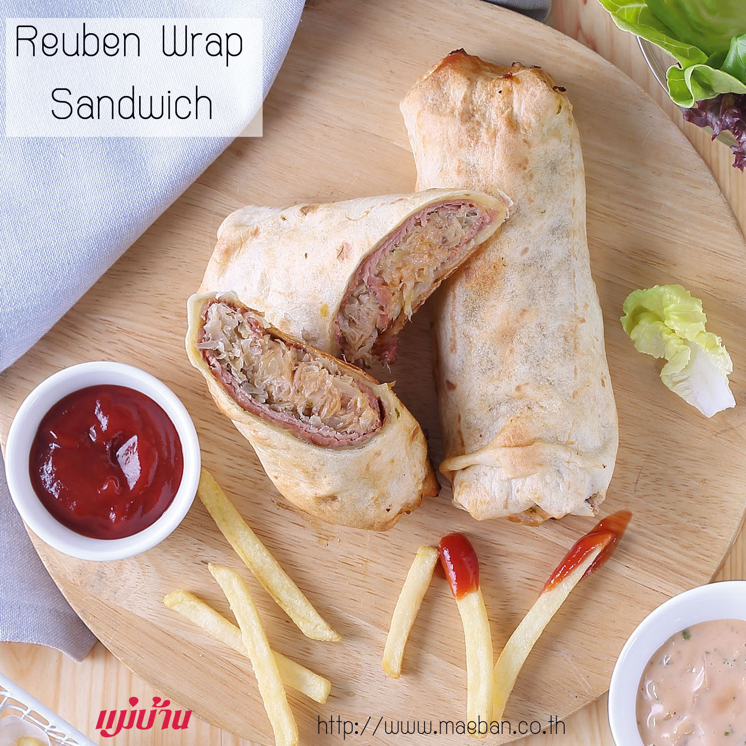 2. วางสวิสชีส เนื้อวัว และกะหล่ำปลีดอง ลงบนแผ่นแป้ง ราดน้ำสลัดเทาซันด์ไอส์แลนด์ ม้วนให้แน่น พับแป้งปิดทั้ง 2 ด้าน ใช้ไม้จิ้มฟันกลัดให้แน่น