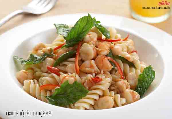 เมนูอาหารฟิวชั่นเลิศรส ที่นำฟูซิลลี พาสต้าเส้นเกลียวเล็กสั้น ขนาดพอดีคำ ของอิตาลี ผัดพอสุกนุ่มกับ กุ้ง สับพอหยาบ รวมถึงใบกะเพราและพริกขี้หนู สมุนไพรริมรั้วบ้านของไทย จนเข้ากันดีแล้ว ก็ตักใส่จานพร้อมเสิร์ฟได้เลยค่ะ แค่รับประทานคำแรกก็สัมผัสได้ถึงความอร่อยแล้ว แบบนี้จะพลาดได้อย่างไรคะ