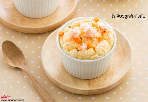 ใครเบื่อไข่เจียวแบบเดิมๆ เชิญทางนี้เลย เราจะพาไปพบกับไข่เจียวในรูปแบบของซูเฟล่ใหม่ที่เก๋ไก๋แสนน่ารัก โดยนำไข่ไก่มาตีจนขึ้นฟู เทใส่ถ้วยใบจิ๋ว ตามด้วยกุ้งสับและแคร์รอต ใส่ในเตาอบ อบจนสุกเนื้อขึ้นฟูสวยได้กลิ่นหอมๆ ก็รู้สึกหิวแล้วล่ะ แค่ตักคำแรกก็สัมผัสถึงเนื้อเนียนนุ่มละมุนลิ้นของไข่เจียว อร่อยฟุดฟุดไปเลยค่ะ