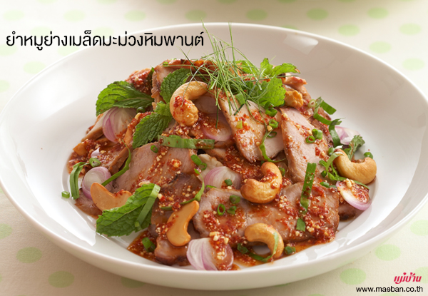เมนูยำรสเด็ดพร้อมเสิร์ฟความอร่อยแล้วจ้า กับ ยำหมูย่างเมล็ดมะม่วงหิมพานต์ เนื้อหมูสันนอกย่างบนไฟจนสุกหอม วางเรียงใส่จาน แล้วเพิ่มความกรุบกรอบด้วยเมล็ดมะม่วงหิมพานต์ และราดด้วยน้ำยำรสแซ่บจัดจ้าน ลงไปนะ โรยด้วยสมุนไพรหอมๆ อีกนิด แค่นี้ก็อร่อยฟินในทุกคำที่ได้ลิ้มลองแล้วล่ะนะ จะบอกให้