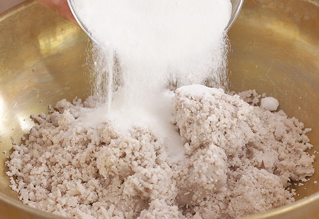 2. ใส่เผือกนึ่ง น้ำตาลทราย และกะทิ ลงในกระทะทอง ยกขึ้นตั้งไฟกวนจนเผือกสุกร่อนไม่ติดกระทะ ยกลงพักไว้ให้เย็นสนิท