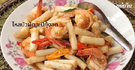 แจกสูตรเมนูข้าวหมดหม้อ ไหลบัวผัดกะปิกุ้งสด กรอบ อร่อย กินเพลิน ไหลบัวหั่นท่อน ผัดคลุกเคล้ากับกะปิ ปรุงรสอีกเล็กน้อย ชิมรสตามชอบ ใครไม่ชอบกุ้งปรับเปลี่ยนเป็นเนื้อสัตว์ชนิดอื่นได้เลย